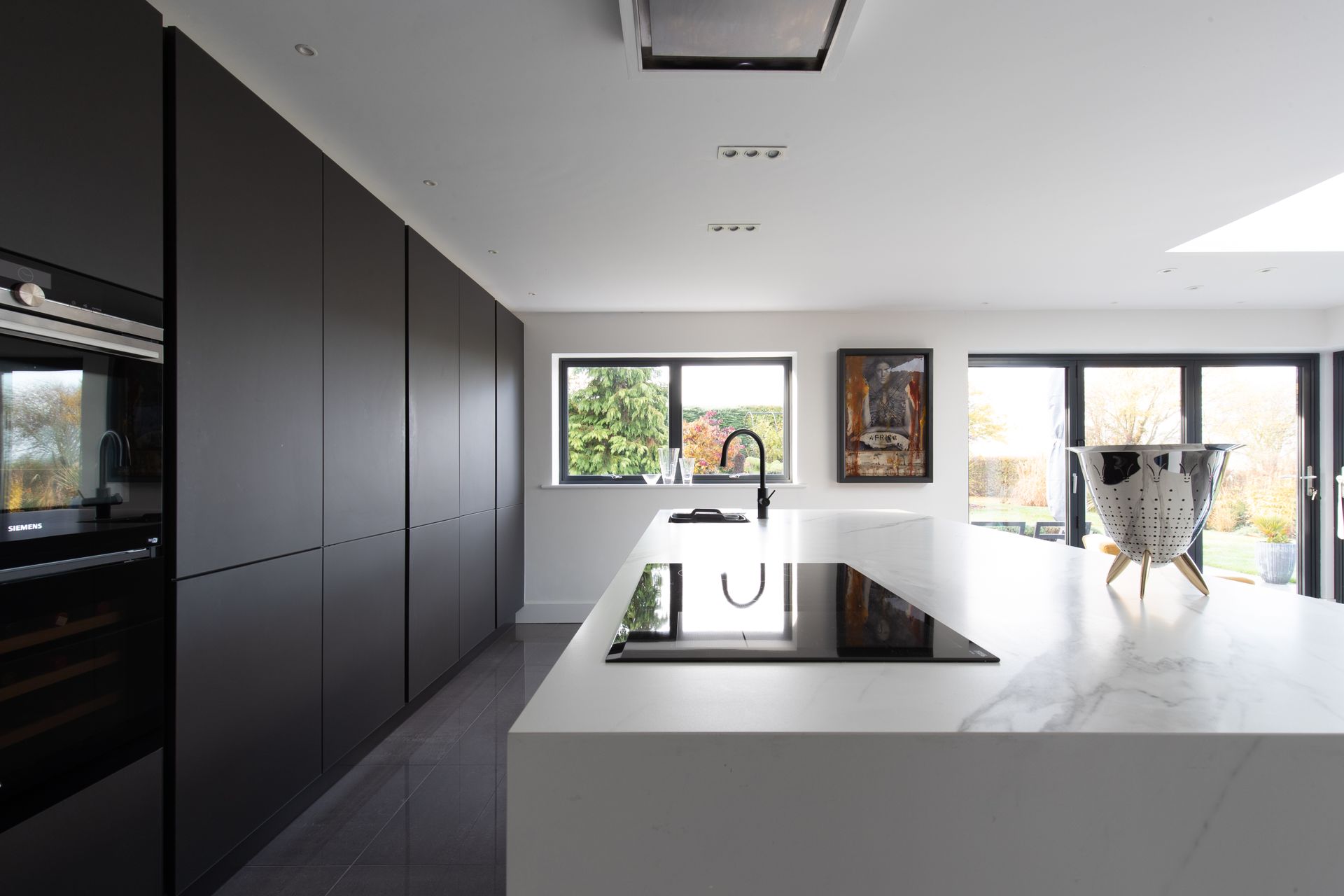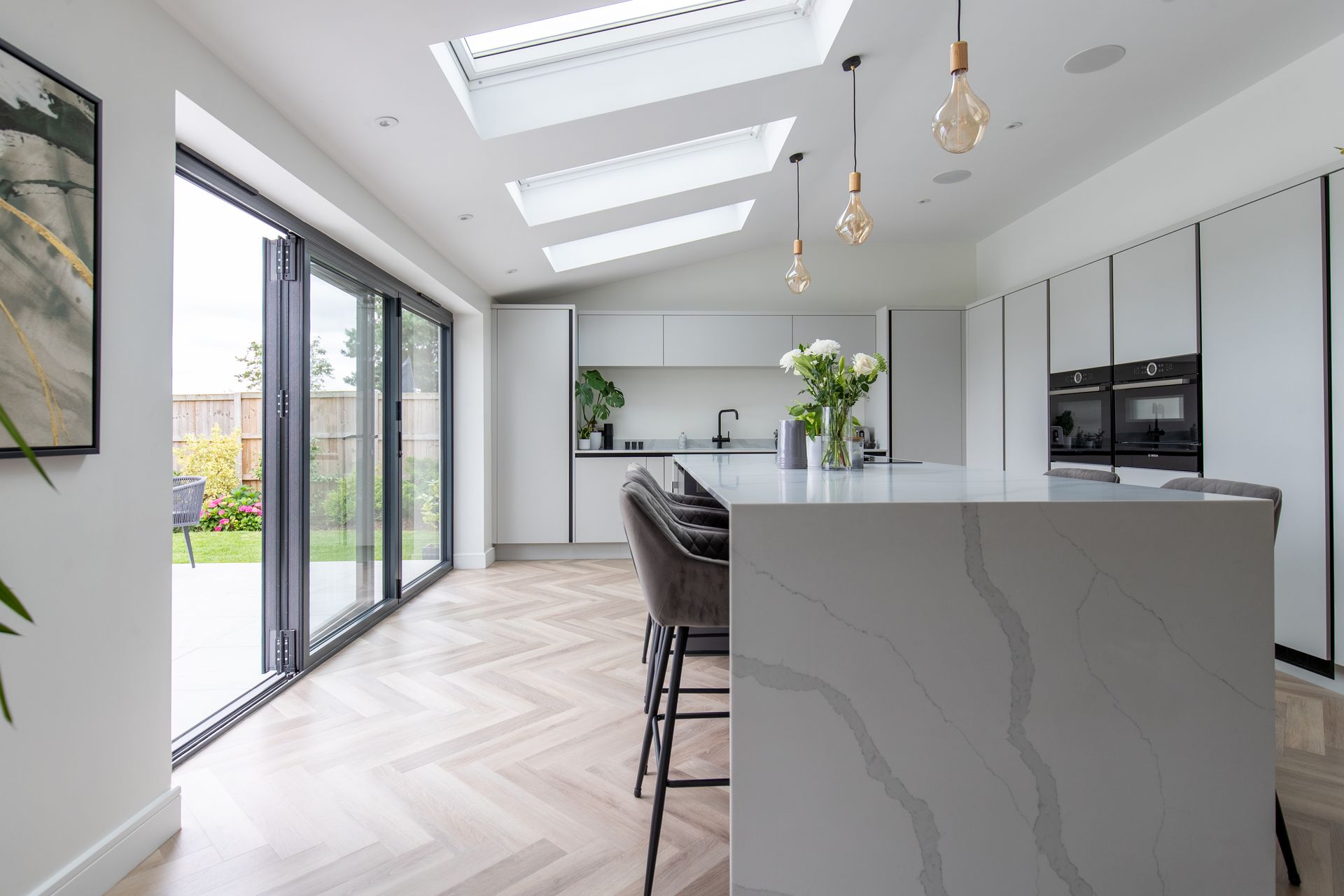 Overlooking a sprawling country landscape, this rear extension frames that view with wide corner bifolds, to allow maximum light into a modern and minimal space. Externally the cantilevered roof provides a stunning canopy to catch shade during the summer months.
